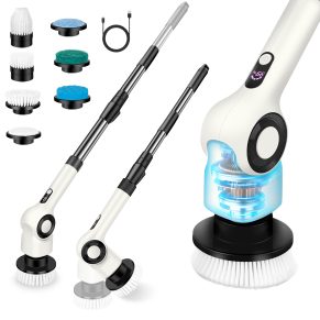 Electric Spin Scrubber, Cordless Power Shower Scrubber with 7 Scrub Brush, 3 Speeds, Adjustable Extension Handle, IPX7 Waterproof Electric Cleaning Brush for Bathroom Tub Tile Kitchen Car- White