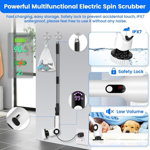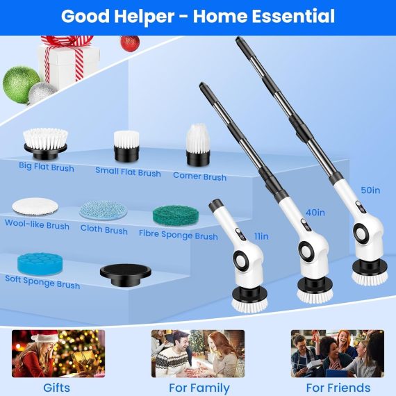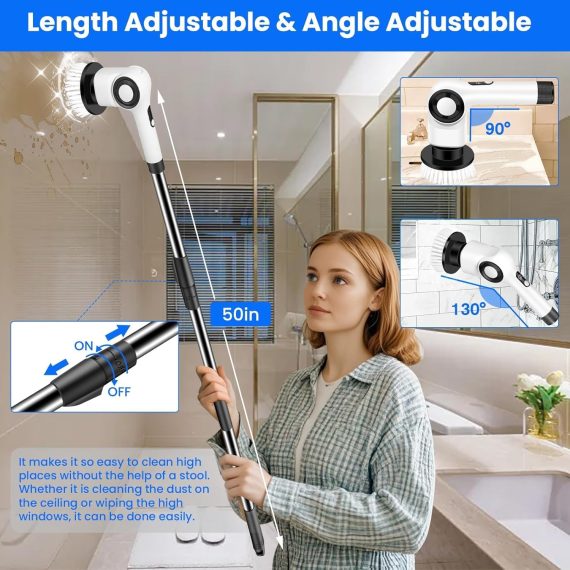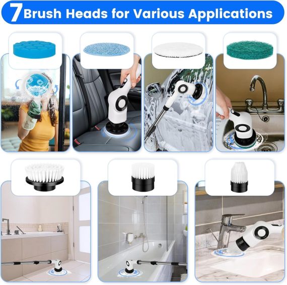 Electric Spin Scrubber, Cordless Power Shower Scrubber with 7 Scrub Brush, 3 Speeds, Adjustable Extension Handle, IPX7 Waterproof Electric Cleaning Brush for Bathroom Tub Tile Kitchen Car- White