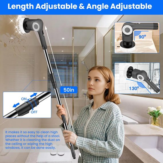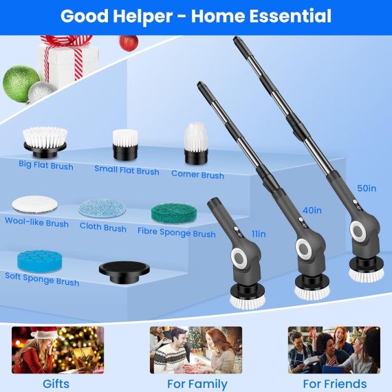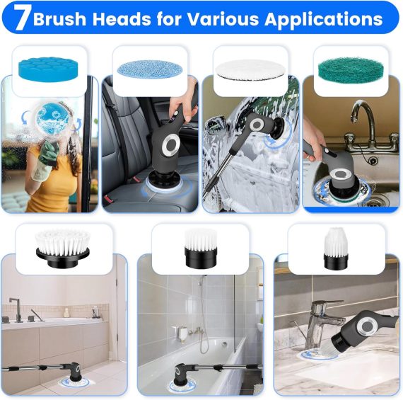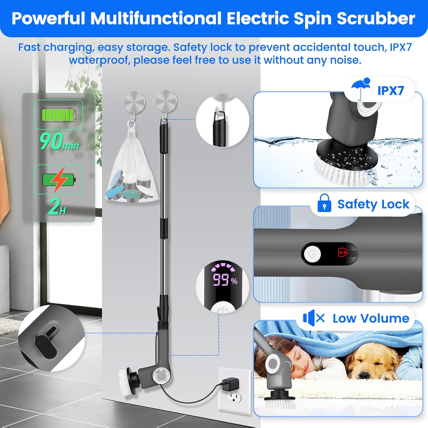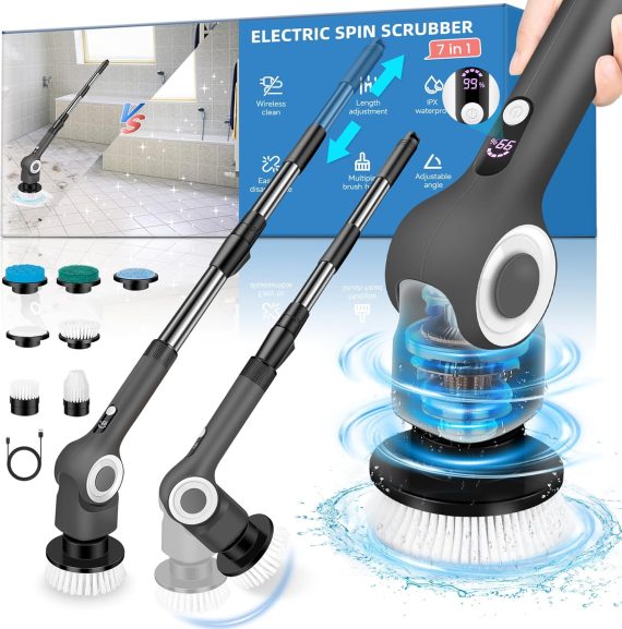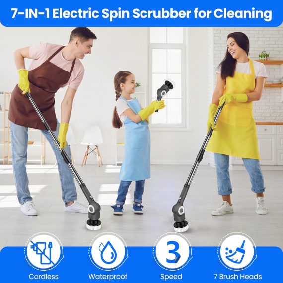 Electric Spin Scrubber, Electric Scrubber with 7 Brush Heads & Extension Handle, Cordless Shower Cleaner IPX7 Bathroom Power Scrubber, Cleaning Brush for Floor Tile, Tub, Kitchen- Dark Grey